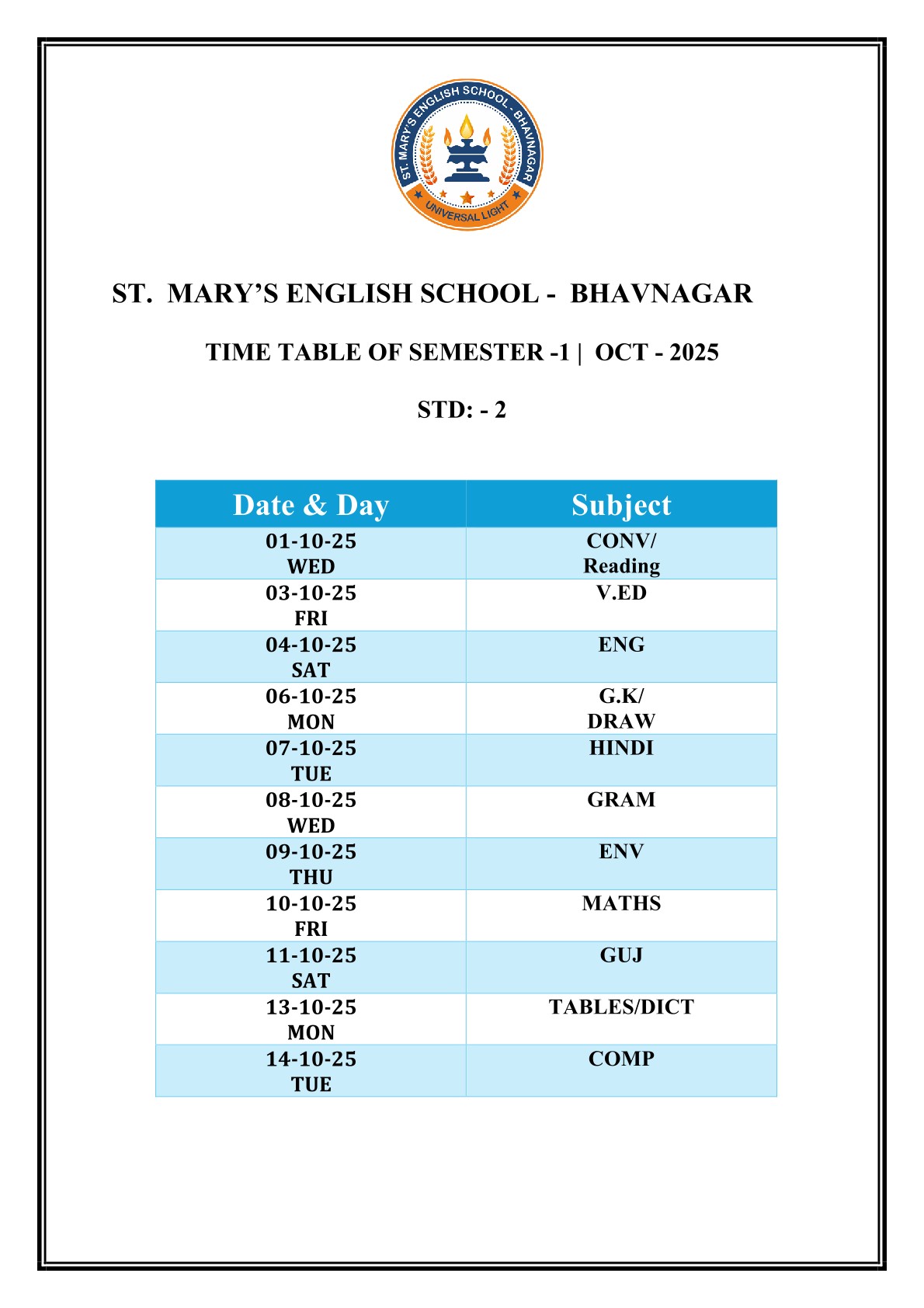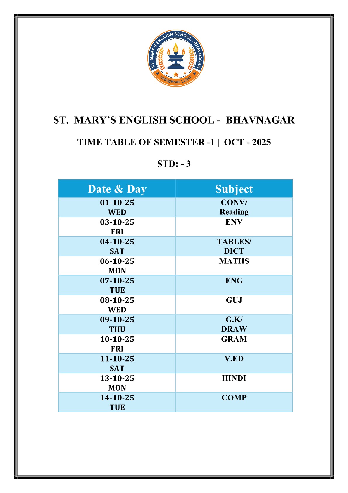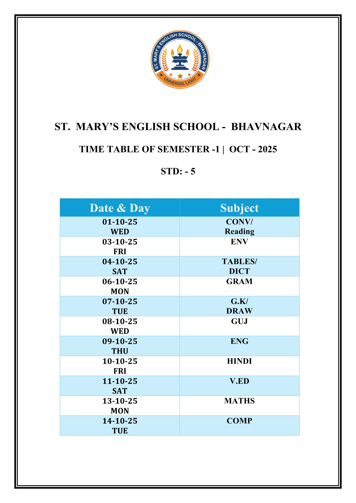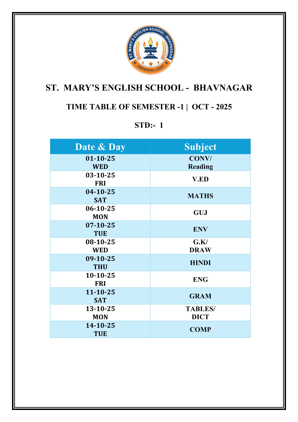 Saint Mary's English Medium School, Bhavnagar is primarily meant to provide Catholic children with sound education based on religious and moral values, but it is open to all, irrespective of religion, caste or community, paying due respect to their religious feelings and freedom of conscience. It promotes religious tolerance and communal harmony.