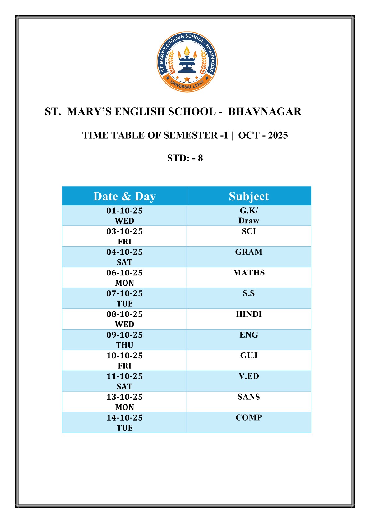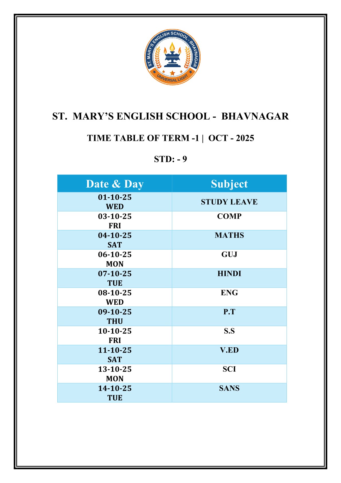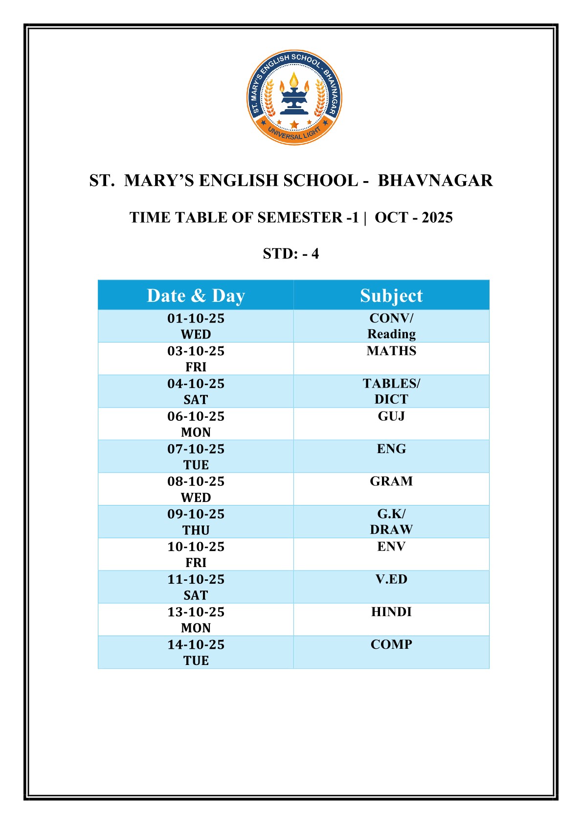 Saint Mary's English Medium School, Bhavnagar is primarily meant to provide Catholic children with sound education based on religious and moral values, but it is open to all, irrespective of religion, caste or community, paying due respect to their religious feelings and freedom of conscience. It promotes religious tolerance and communal harmony.