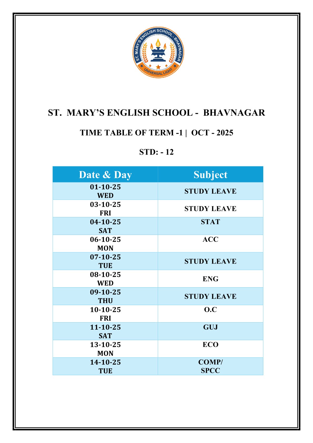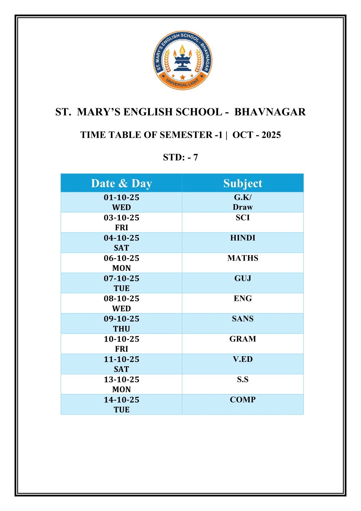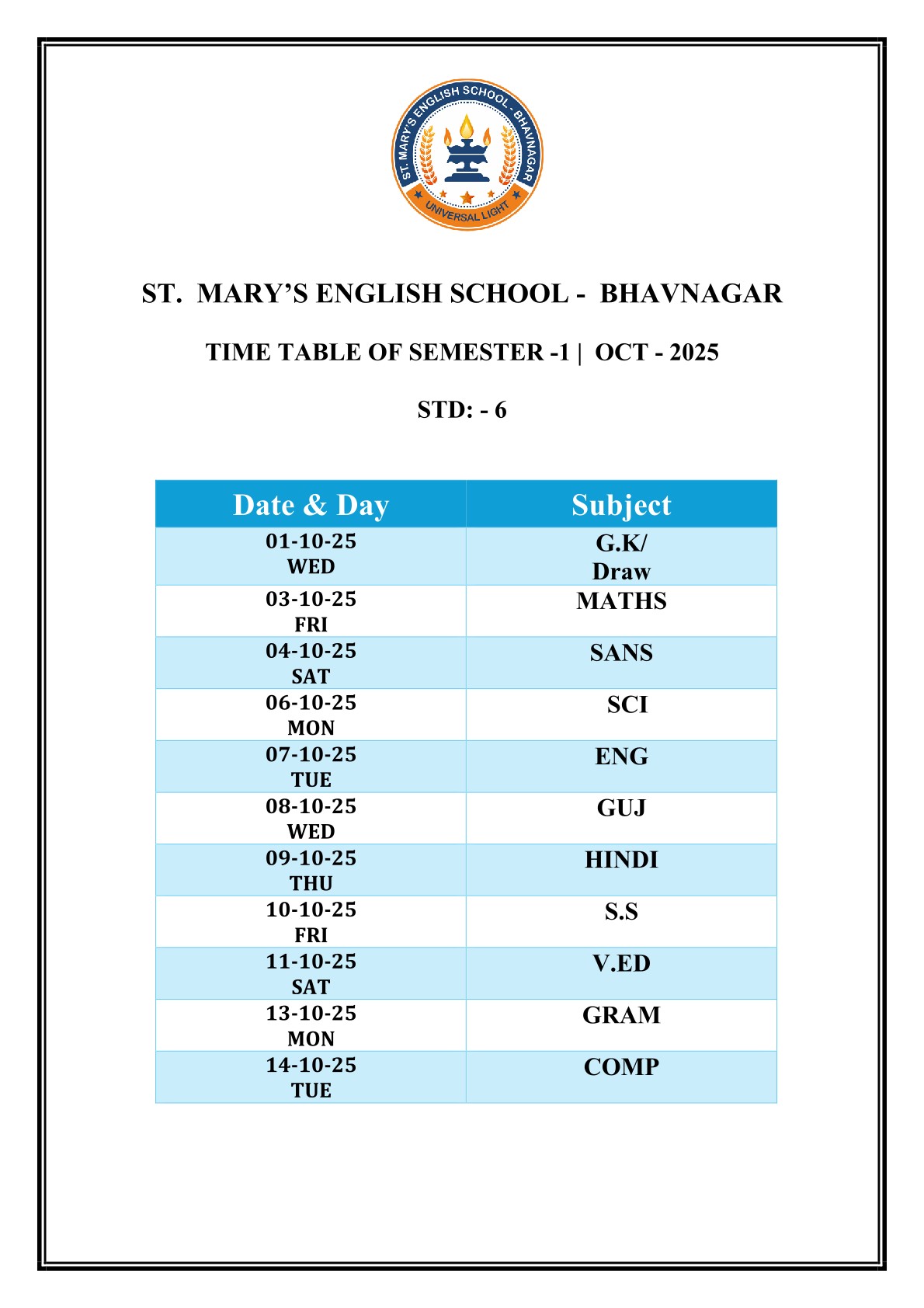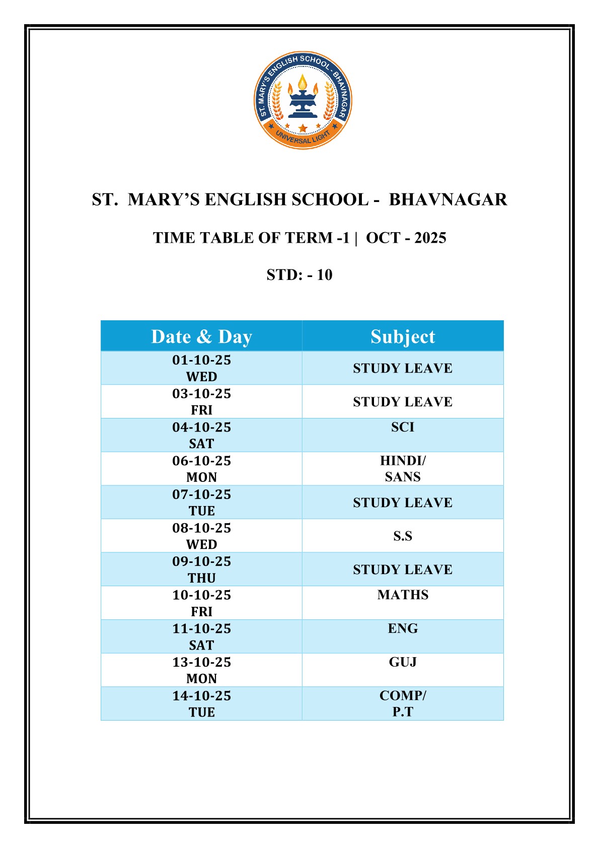 Saint Mary's English Medium School, Bhavnagar is primarily meant to provide Catholic children with sound education based on religious and moral values, but it is open to all, irrespective of religion, caste or community, paying due respect to their religious feelings and freedom of conscience. It promotes religious tolerance and communal harmony.